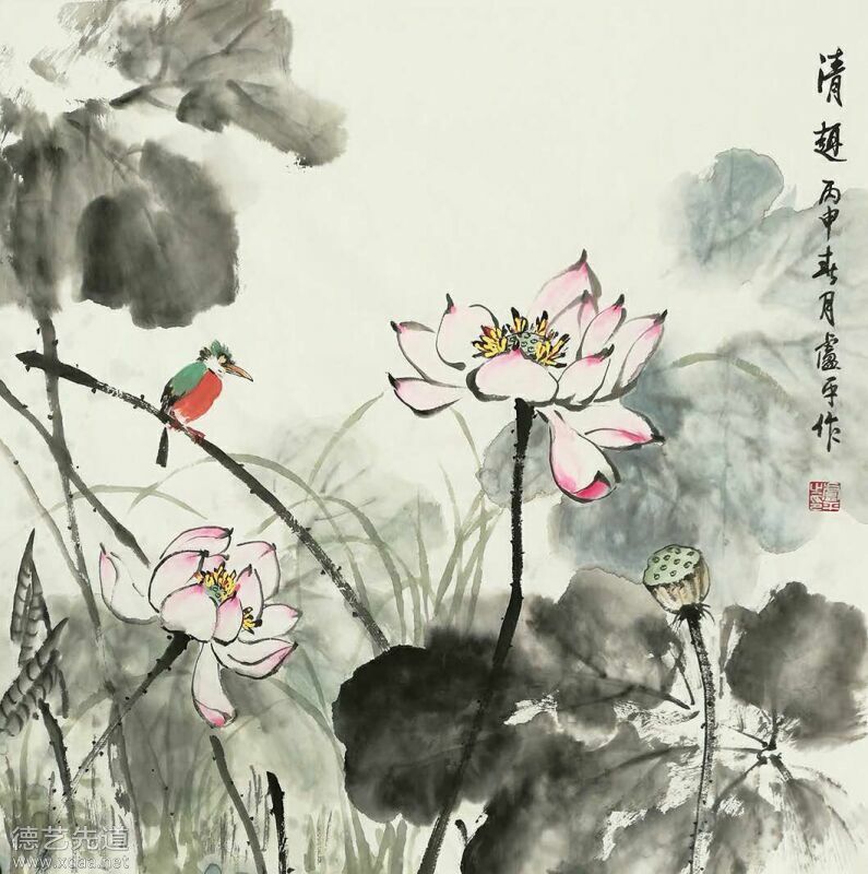 卢平花鸟画作品_翠鸟荷花