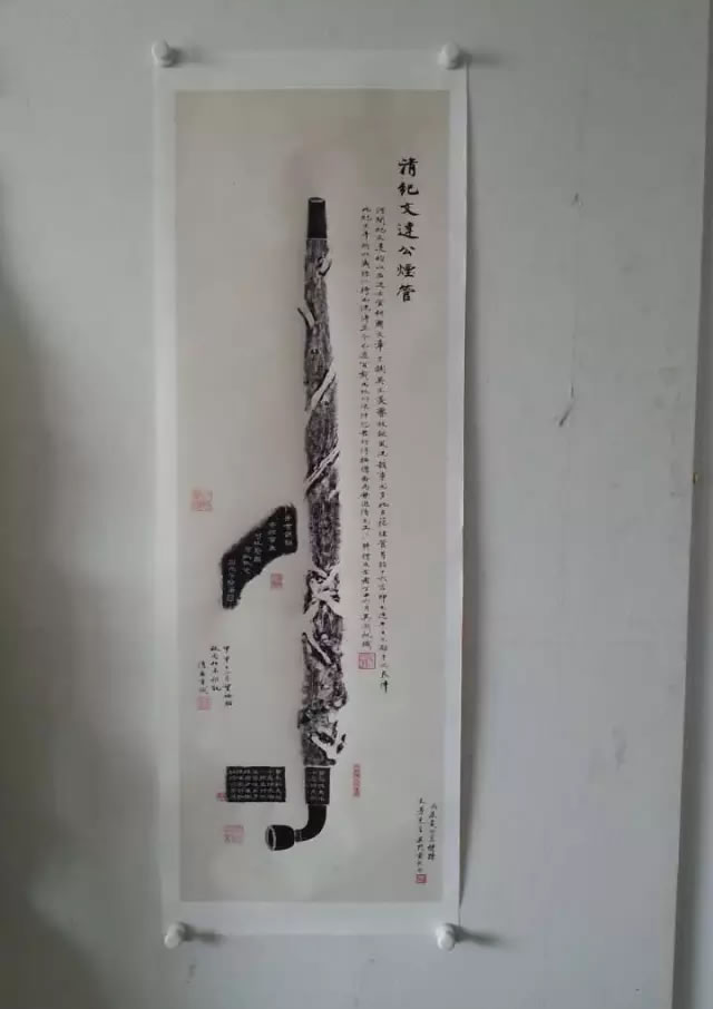 纪清远先生的画家天赋是与他的祖先纪晓岚分不开的。对于这位清代第一才子,纪清远从不直呼其名,而是很尊敬的称他为“文达公”,这也是纪晓岚去世后嘉庆皇帝御封的谥号。在我们的制作人小强去纪清远先生的书斋采访他的时候,纪先生正好收集到了一份纪晓岚所用的大烟袋的铭文拓片。