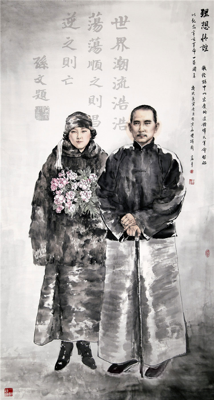 卢平女士就具备这种艺术家的“导演”功夫。她的创作经验告诉我们,创作前要收集很多资料、选择布局。比如在纪念辛亥革命100周年时,她的创作是绘制孙中山先生和宋庆龄女士的作品《理想、情谊》。她为这幅作品查阅了大量的图片资料,力求能用绘画的形式表达出这两位先行者的革命精神和高尚的情操。此外,她还画过不同时期的宋庆龄,《风范照千秋》这幅作品是描绘和平时期的宋庆龄。和平时期的宋庆龄女士形象如何刻画?她了解到宋庆龄是位和平使者喜欢养鸽子,故居中种了好多海棠花。并以海棠花和飞翔的鸽子为背景,人物刻划上尽量展出她那母爱慈祥的风采,从而体现了它这个人物在典型环境中的典型性格,以及她独有的风貌;《危难有巾帼》描绘的是抗战时期的宋庆龄,当时她为革命四处奔走,组织学生走向街头游行,去慰问童子军等。于是,在卢平的画中,宋庆龄女士手拿雨伞,面部表情坚强,在风雨飘摇之中行走,背景中布满了滚滚乌云,在手法上使用做旧的画法,这样的塑造,使两个不同时期的宋庆龄女士风貌迥异;《京剧大师程砚秋》这幅作品描绘是京剧四大名旦之一的程砚秋先生,他的作品主要是青衣,大多是悲苦的,他与梅兰芳先生不一样,梅兰芳先生艺术风格是雍容华贵。所以,在卢平女士的画中,程砚秋先生身着青衣,悠闲地在院子里练习手法和身段,秋风残枝伤感凄凄,地上一片黄叶犹如人的命运般飘洒着坠落地上,黑色的衣服烘托着悲苦的意境,充分而深层次地展现出画中主人的岁月沧桑。在画家的意念里,如果画程砚秋先生彩扮之后的形象,这幅画就失去了它的特点和意境了。所以,要画历史人物,你要画什么?首先要和他的情节和历史背景、环境相符合,这是在塑造人物精神面貌中至关重要的一环。记得,卢平女士曾创作过一幅反映北京的《中国年》大型画作。在这幅创作中,她首先考虑的是人文背景和北京的特点,只有抓住这些才能表现出北京的中国年特色。她选择了春节逛庙会的场景,这无疑是北京人最具影响力的活动。每年那里人极多,成人吃玩,孩童骑项,左手风车,右手糖葫,亦有手悬鞭炮者,画面远处公交车待运,还有庙会牌楼的隐约。主景红灯笼占大半画面,突出中国红的特点,极致地表现了热闹的过年场景。“因此说,一幅完美的创作画面不但要考虑主题人物的布局、用色,还要考虑人物的环境、道具,它的每一个道具、每一个动作的选择,在画面里都能起到重要的烘托主题作用!”卢平女士给我们诠释着创作的经验,也讲解着她融入作品中的意境。